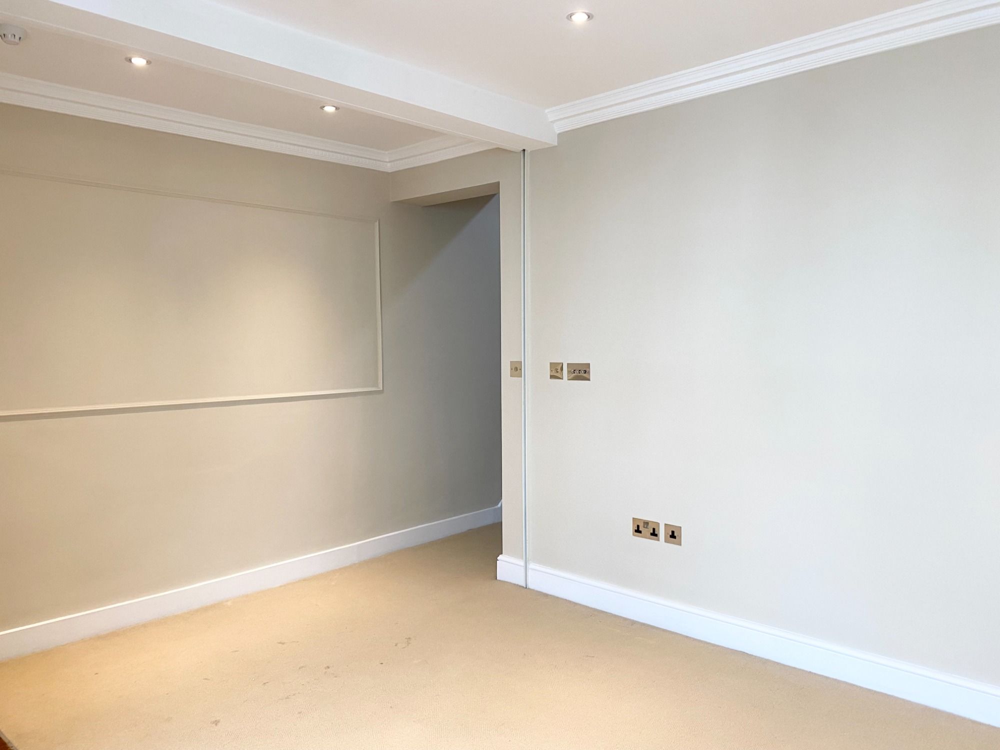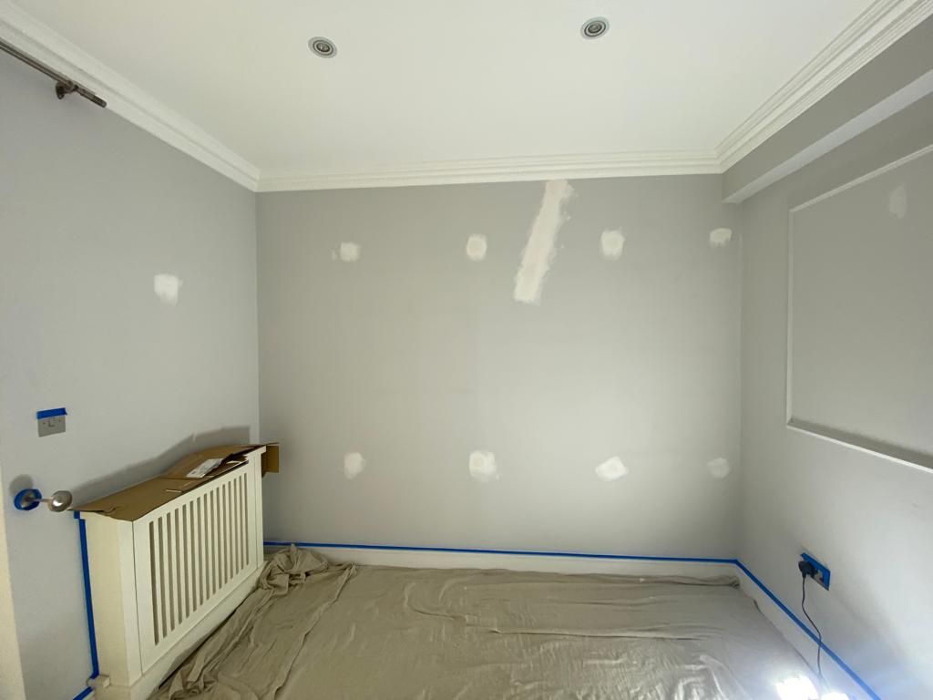 Repairs were carried out to address wall imperfections, before the repainting of ceilings, cornicing, walls, wood panelling, and skirting boards throughout, using Farrow & Ball paint.