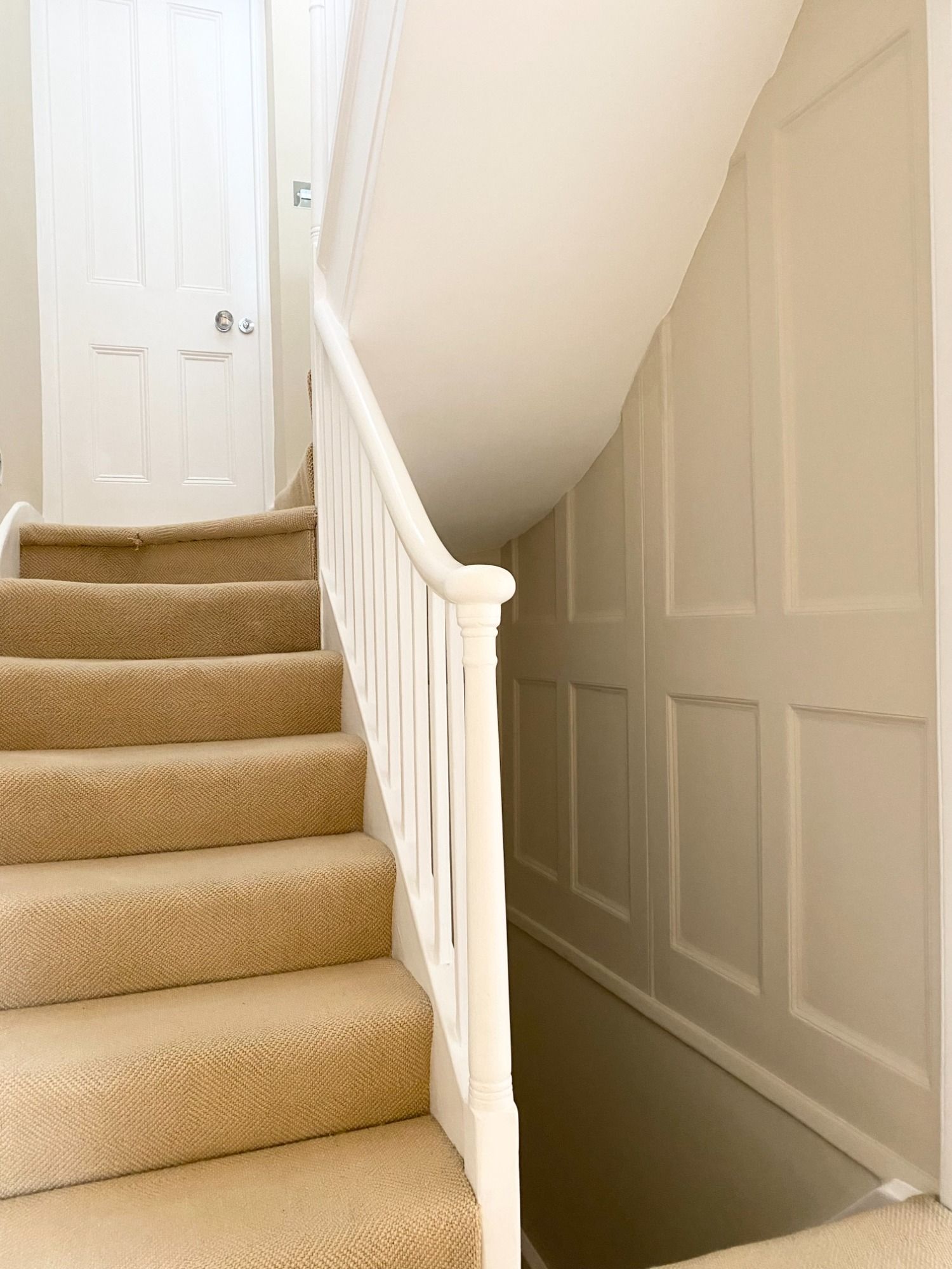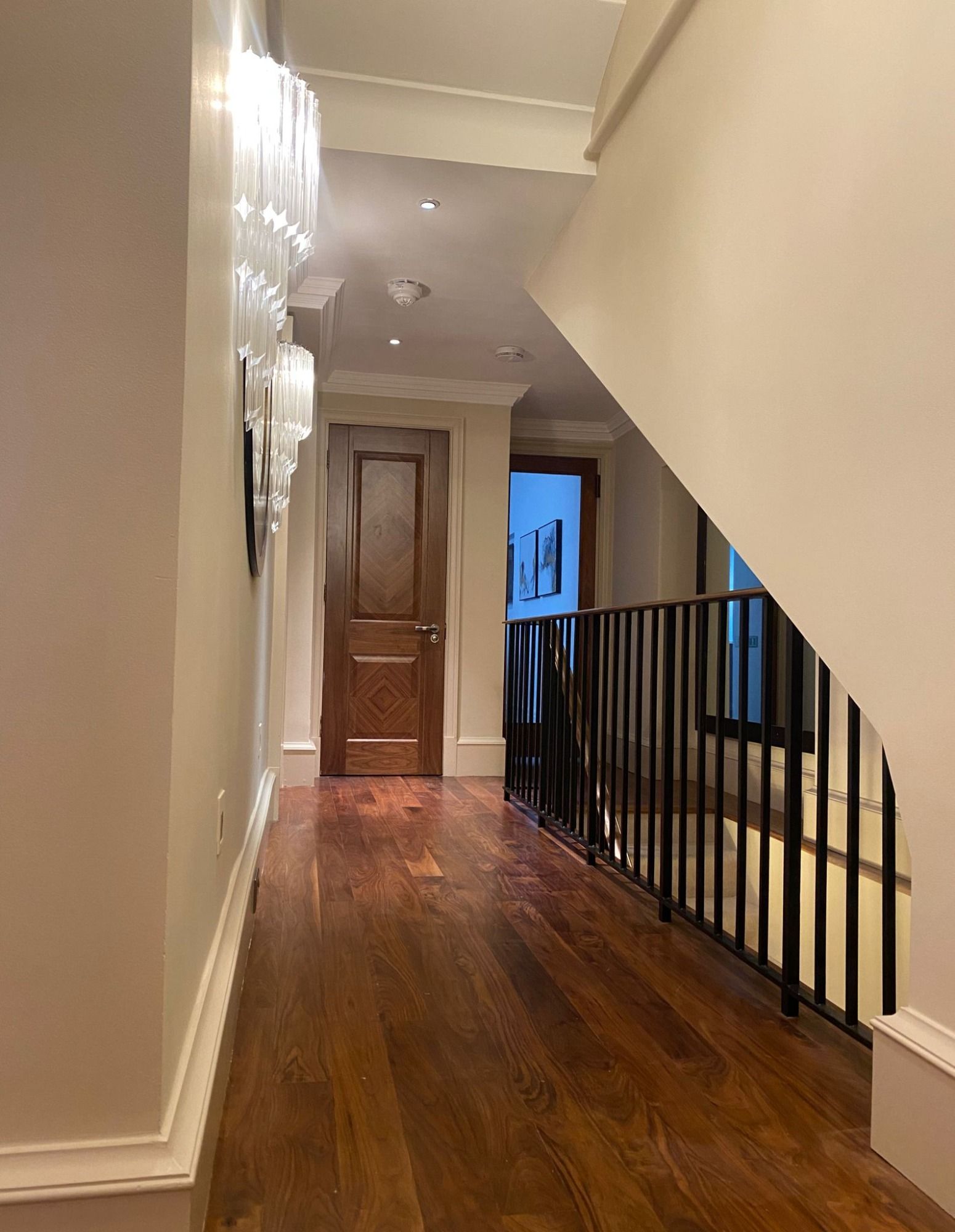 After these repairs, Farrow & Ball paint was applied to ceilings, walls, wood panelling, door frames and skirting boards, across the reception, three bedrooms, open-plan kitching / dining area, utility room, and hallway, stairs and landings spanning all five floors of the property.